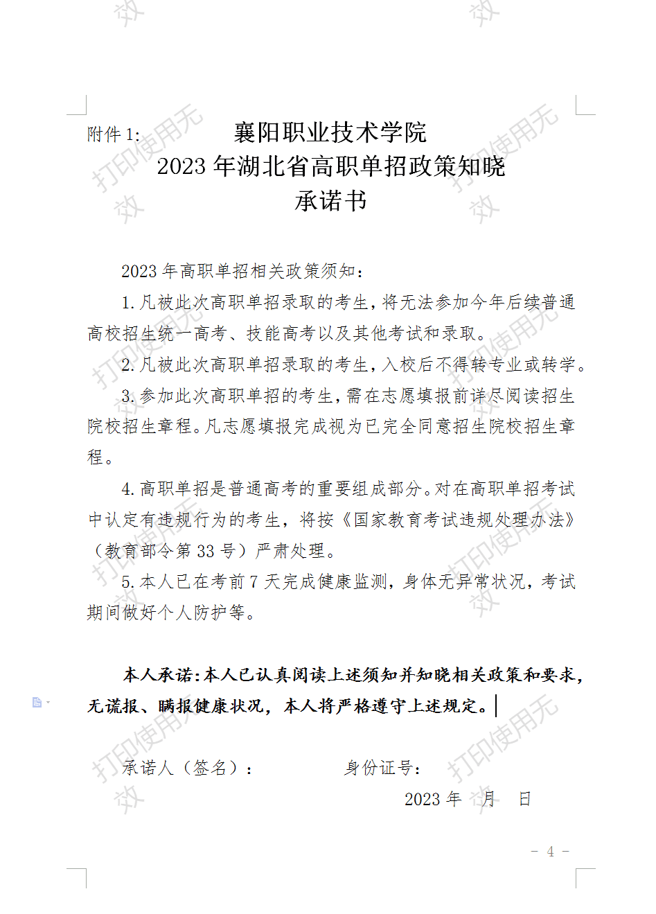 报考我校高职单独考试招生的考生,在考前一天(3月31日17:00前)到学校招生工作处明德楼104室签订《单独考生招生政策知晓承诺书》并领取准考证。凡未签订承诺书的视为自动放弃考试资格。